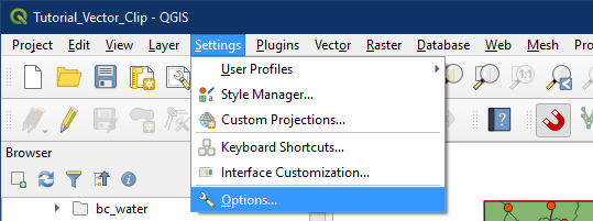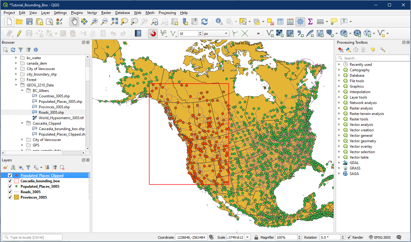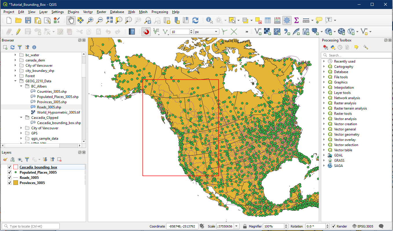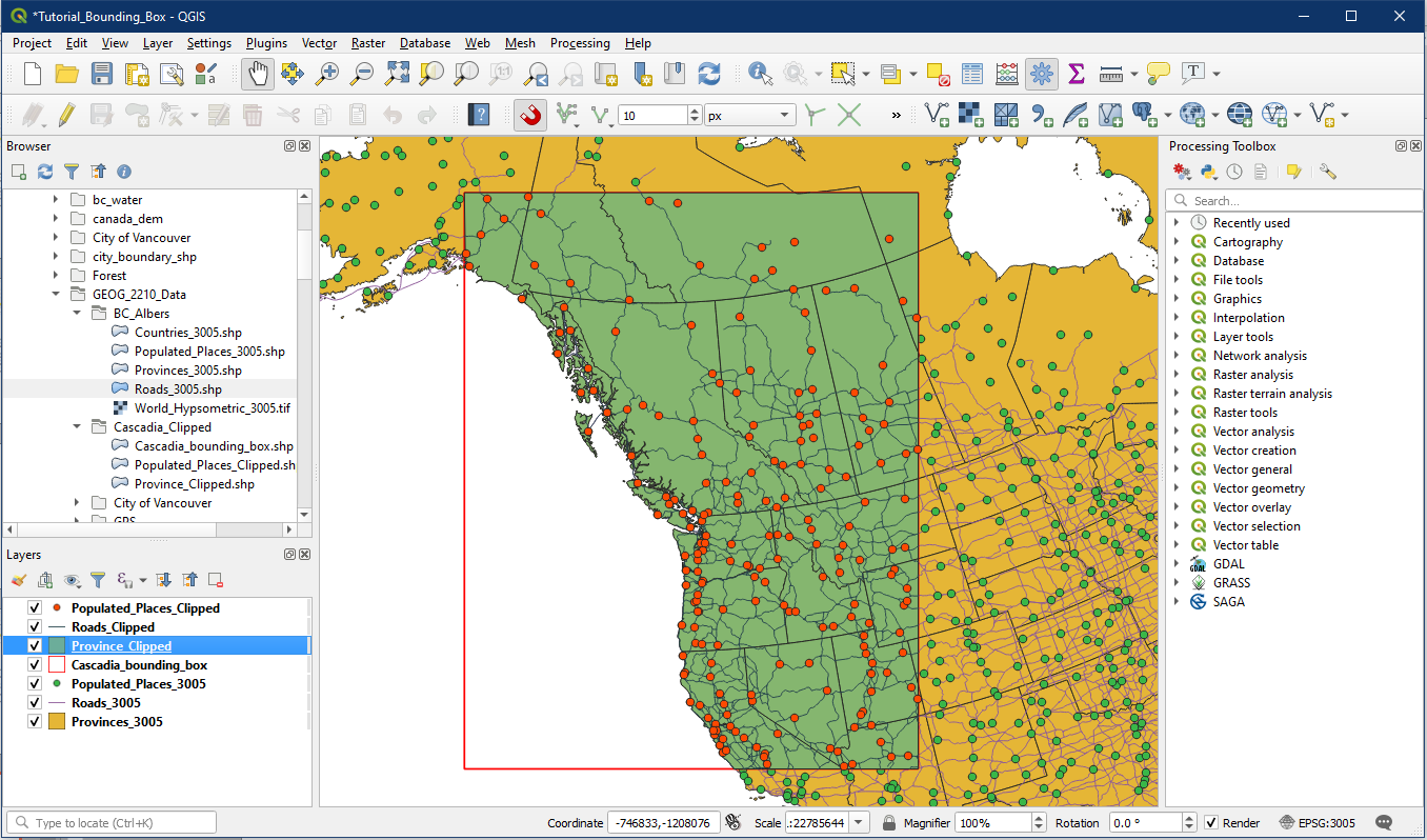 Now we will clip our vector layers using the Cascadia bounding box. In the top menu, select Vector > Geoprocessing Tools > Clip.