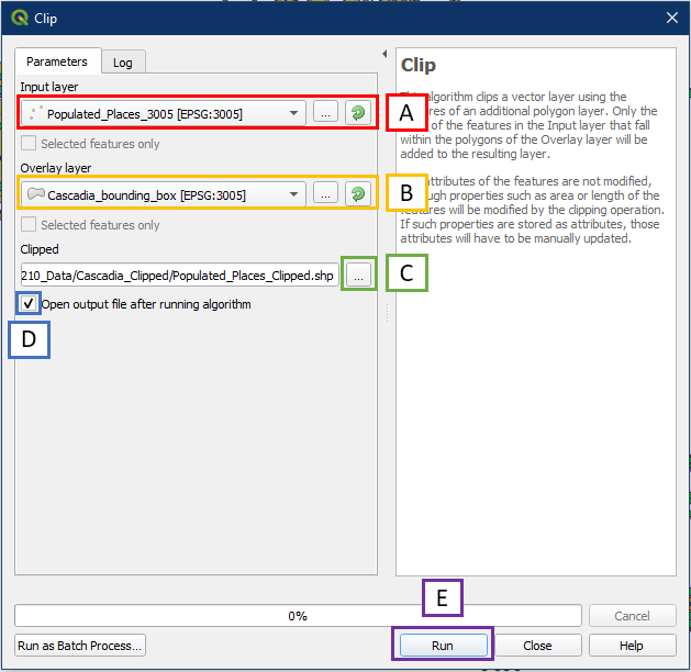- For Overlay layer, choose the bounding box layer Cascadia_bounding_box. Notice how it shows the EPSG so we can be sure that the input and overlay layers have matching EPSG.