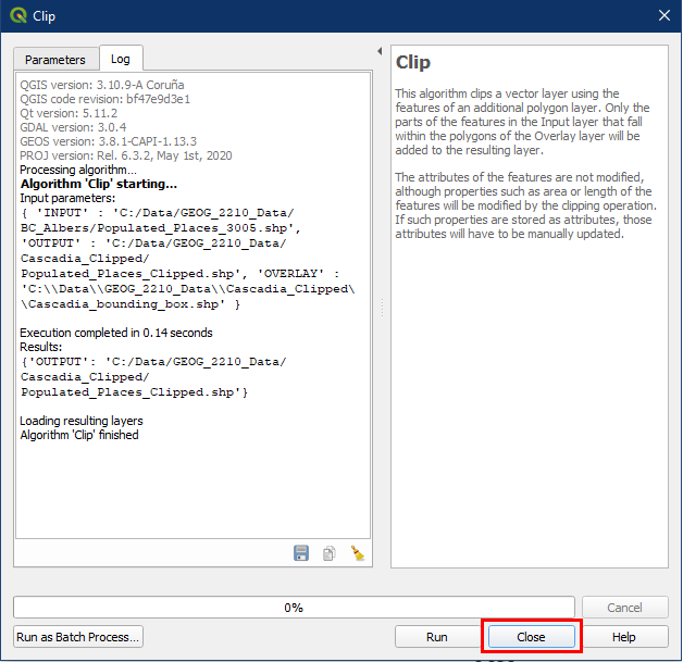 Click Close once the log says Algorithm Clip finished.