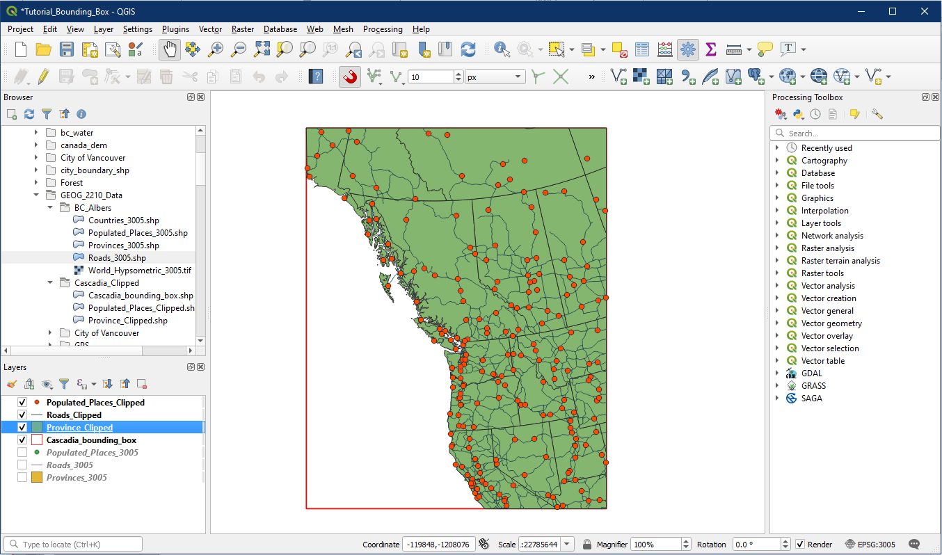 Open your Tutorial_14 project. You may already have the province and bounding box layers in the project. Also add the remaining BC Albers vector layers so that we have: