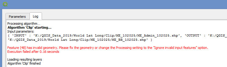 ** If you are clipping your vector layers and receive an error message that mentions features with invalid geometry, it is because your settings will not allow for the polygons to be split or splice by the clipping action.