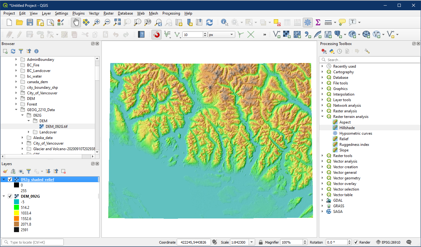 - Alternatively, within the Processing Toolbox expand the Raster terrain analysis tools and select Hillshade. The Processing Toolbox is harder to navigate, but contains every single tool in QGIS.