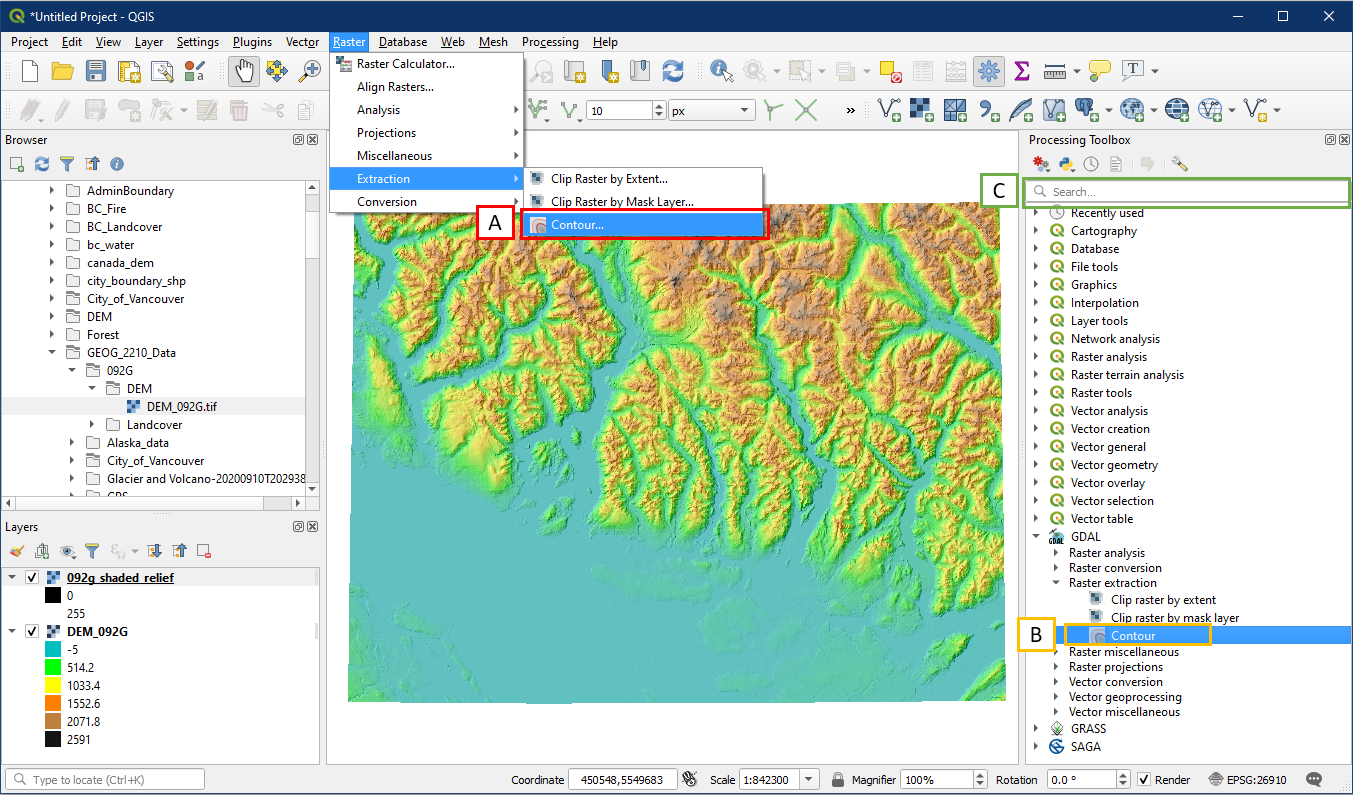 - Raster menu button > Extraction > Contour