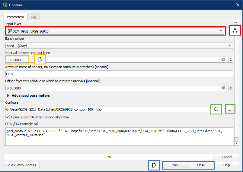 - Under Elevation layer, select the DEM_092G layer (it should be automatically selected if it was the only raster layer in your layer panel)