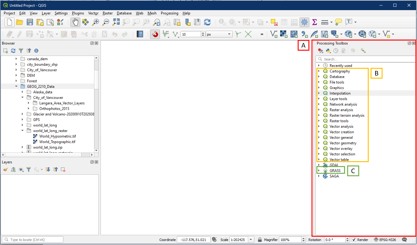 The Processing Toolbox panel (A) should now be displayed on your QGIS GUI. Within it, we will find all the QGIS tools available (B) within tool categories that has the QGIS logo. Additionally, we will use some tools from the GRASS toolbox (C). Grass GIS is a different open-source GIS software, but is supported by the same foundation of members of OSGEO. Hence the compatibility between the two GIS programs.