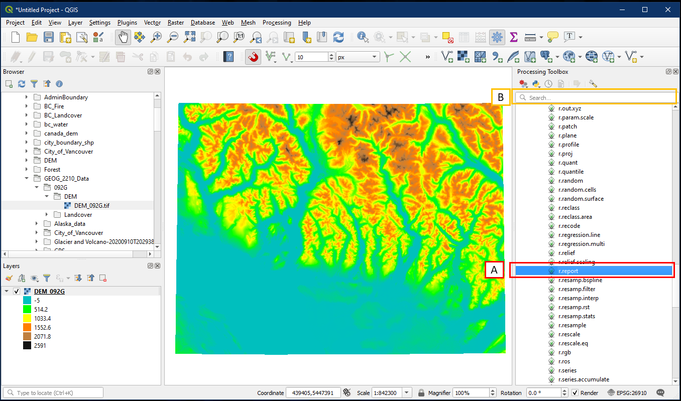 We want to create a basic text report via the r.report tool. In the Processing Toolbox select GRASS > Raster > r.report (A). Alternatively, search for “r.report” using the search box (B).