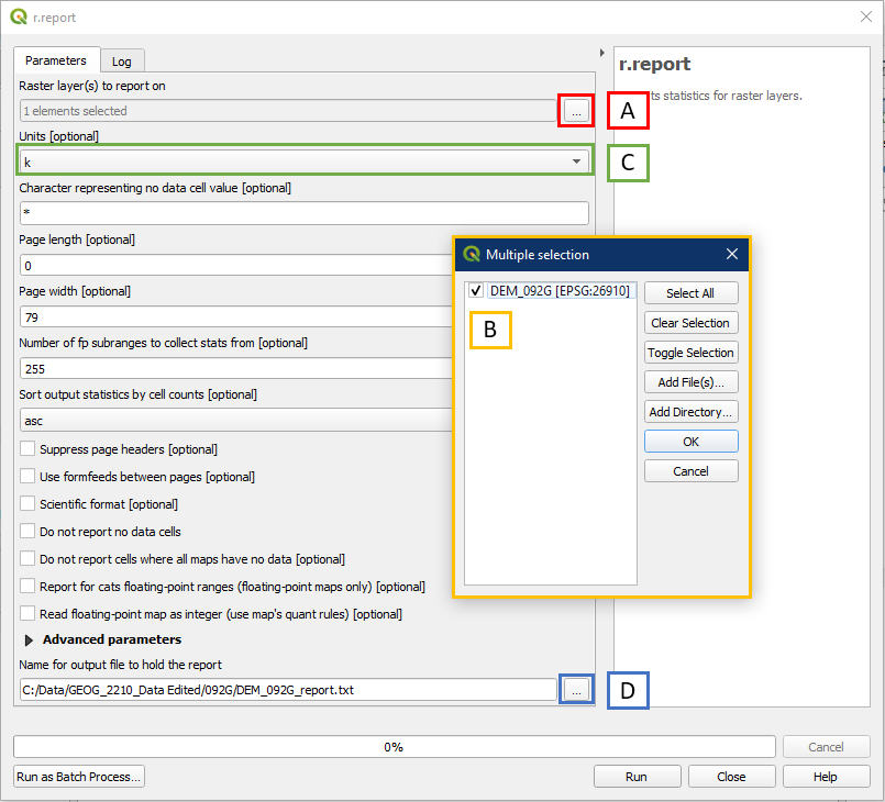 - Under Raster layers to report on, click the “…” button to select the layer to report on