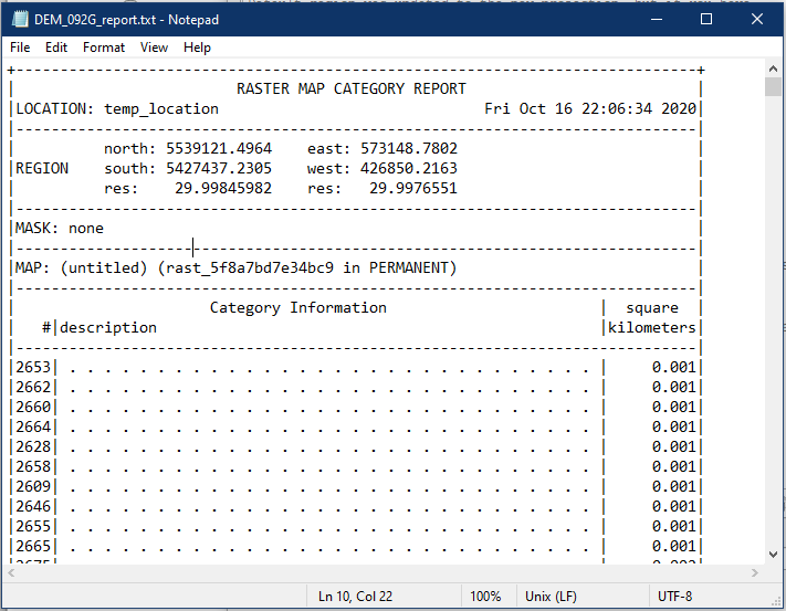 Browse to your folder location and open the report TXT file. It will contain information like raster extent, resolution (res) and the area for each pixel value.