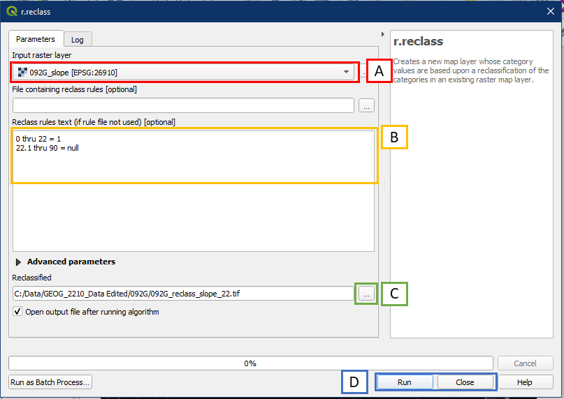 In the r.reclass dialog window, set the following settings: