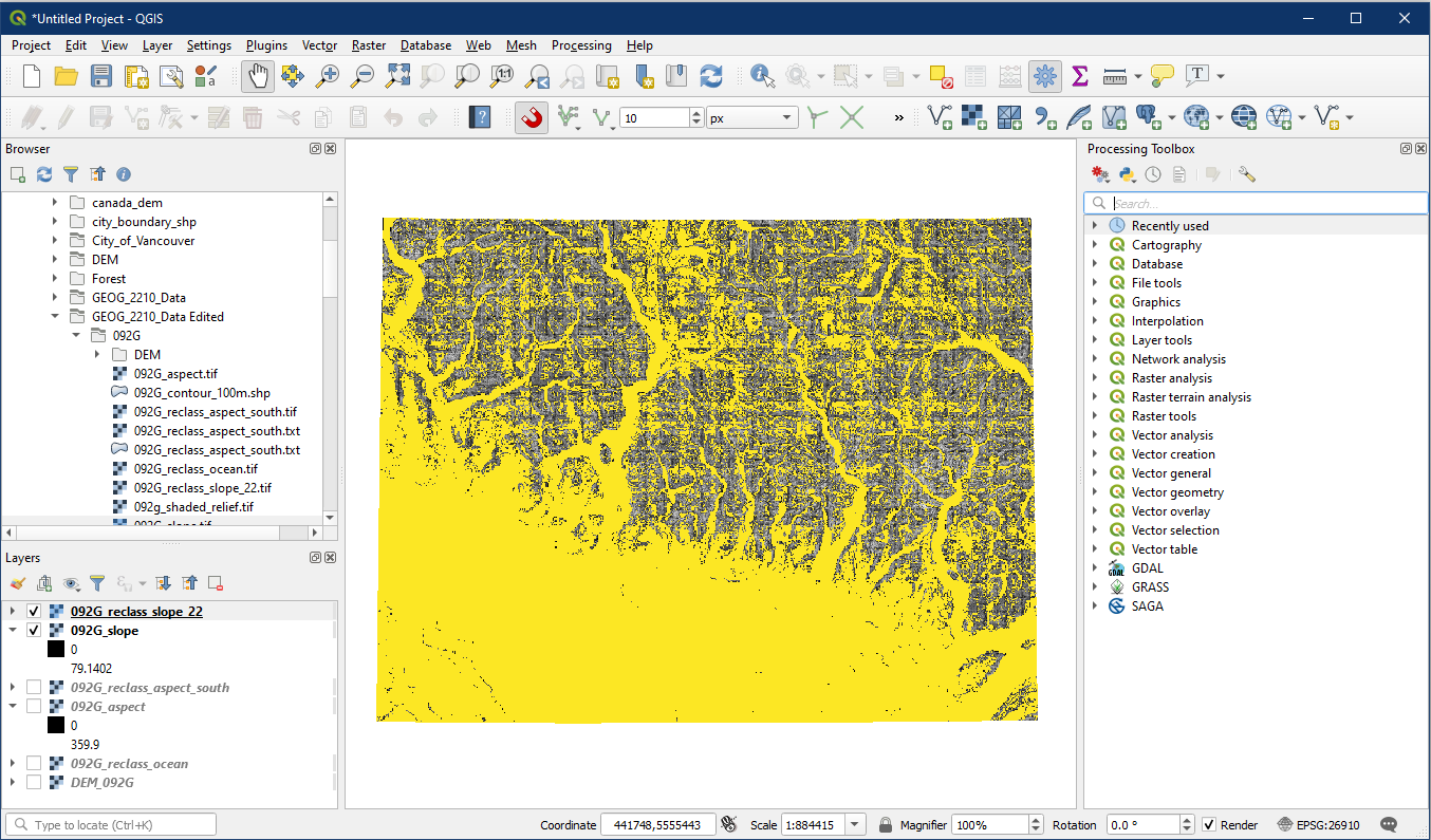 Run the r.report tool on this layer and have a look at the information. Notice that the area with a value of 1 should be smaller than both the reclassified slope and aspect layers, since only areas they have in common are displayed here.