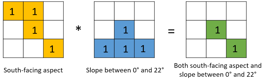 The resulting layer will contain areas that are both south-facing aspect and has slope between 0° and 22°.