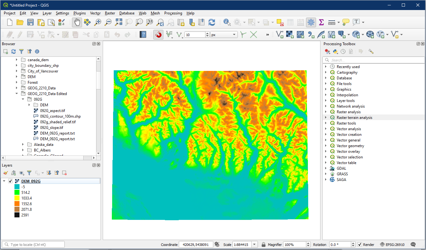 Open a new QGIS project and load the DEM_092G raster layer. The layer should be black and white by default, so change the colour based on tutorial 10 (Quantitative Raster Data section), but for Mode choose Continuous instead of Quantile.
