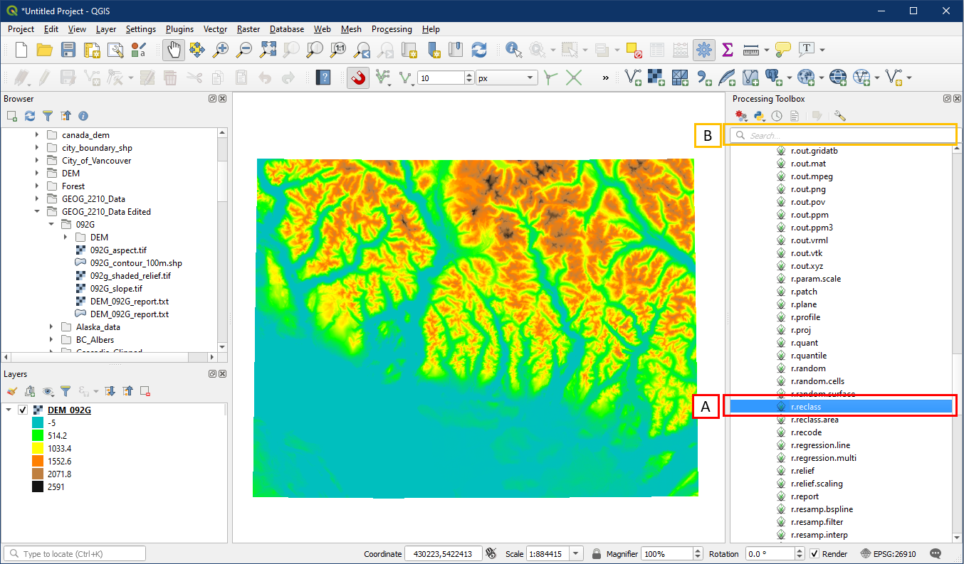 In the Processing Toolbox, go to GRASS > Raster > r.reclass (A). Alternatively, search for “r.reclass” in the search box (B).