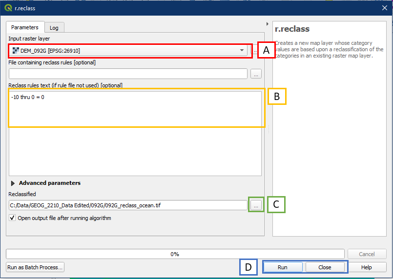- Click the “…” button to Save to File, choose a folder location and file name for the reclassified layer. Call it 092G_reclass_ocean