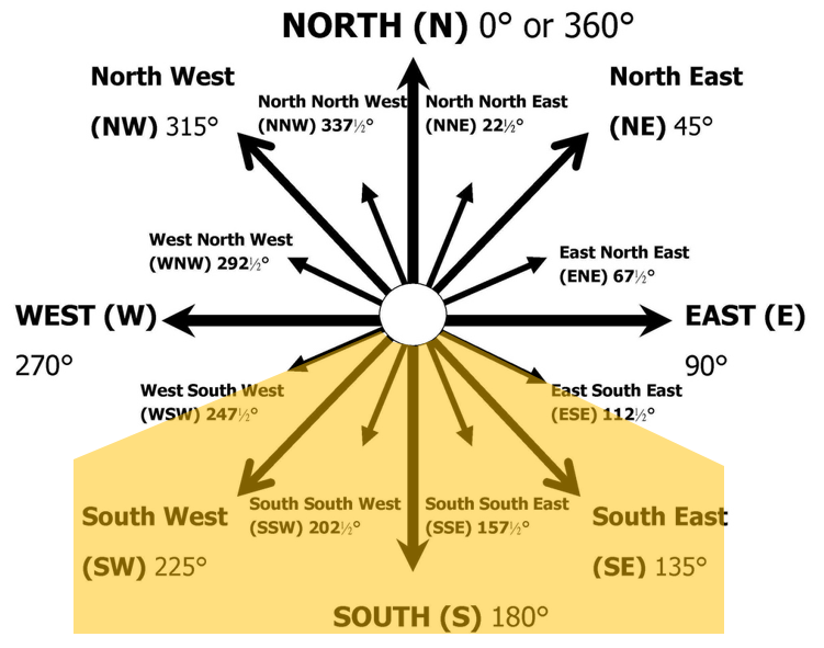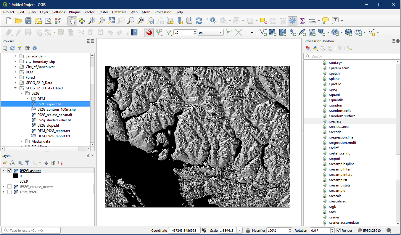 In this example let’s pretend that we are interested in evaluating potential solar panel sites on the slopes surrounding Vancouver. We know that we cannot install solar panels on a north aspect, and that the best aspects are from East-South-East (112.5°) to West-South-West (247.5°).