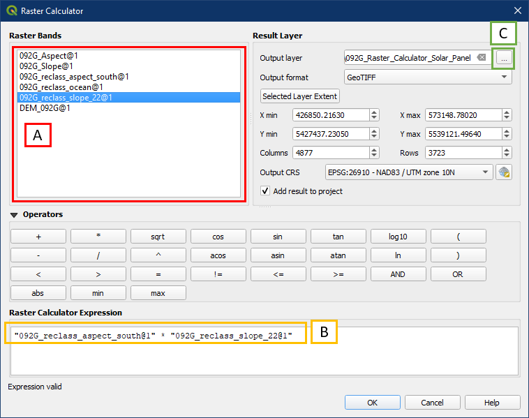 - Double click the layers in the Raster Bands box to add them to the Raster Calculator Expression area (B)