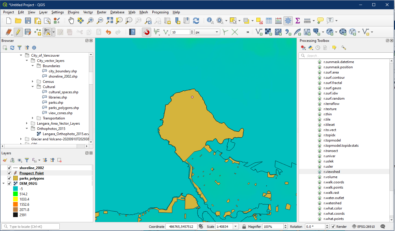 In this activity we want to create a viewshed for Prospect Point in Stanley Park, to assess the areas that are visible.