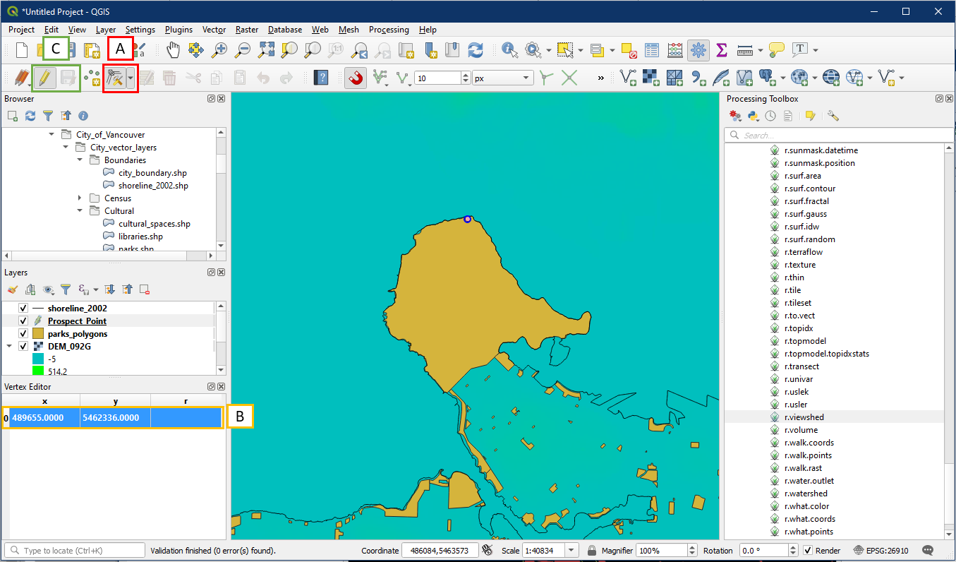 We will now fine tune the location of Prospect Point. While editing mode is still on for your new point layer, select the Vertex Tool (A). With Vertex Tool on, right click on you’re the point you created and the Vertex Editor panel should appear (B). Within the vertex Editor enter the coordinates x = 489655, y = 5462336. Make sure to save your edit and turn off editing mode afterwards (C).