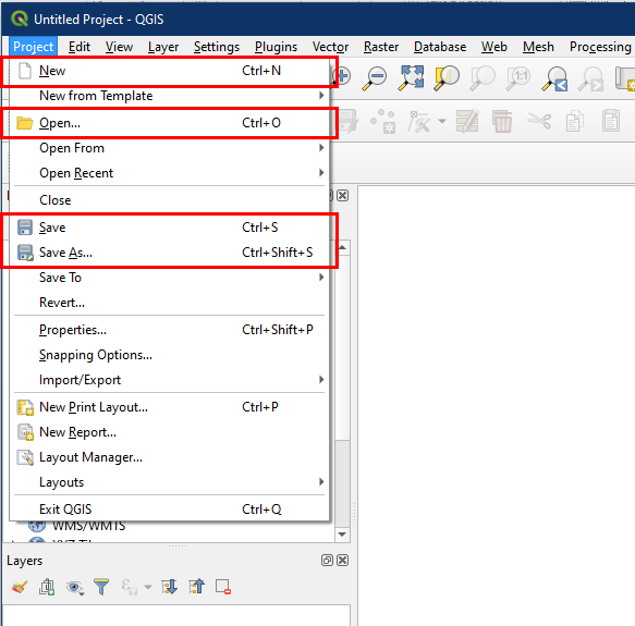 When QGIS is opened, a list of recent projects will be displayed for easy access. Projects can be created, saved, and opened through the Project menu.