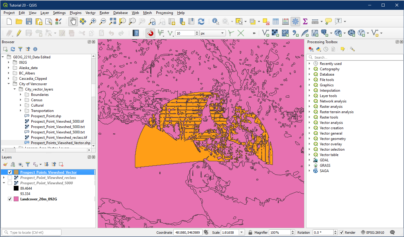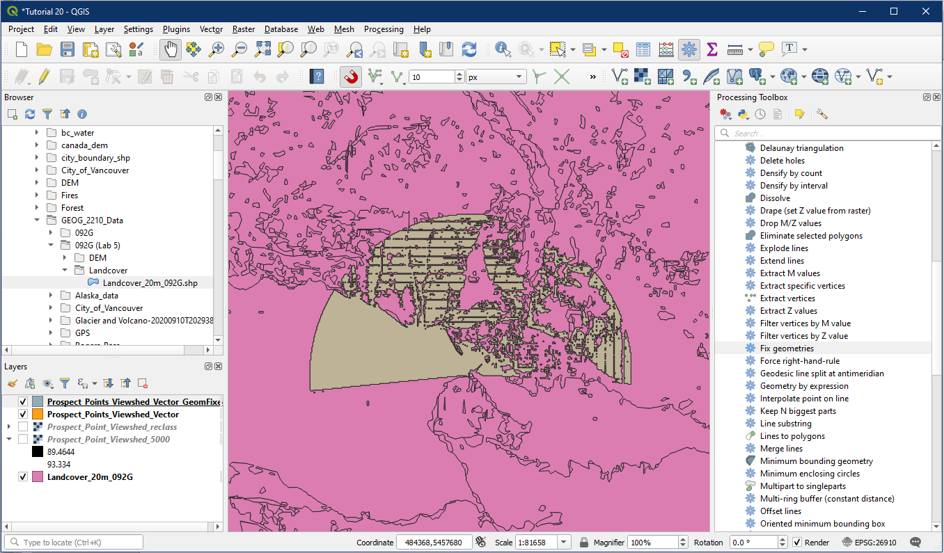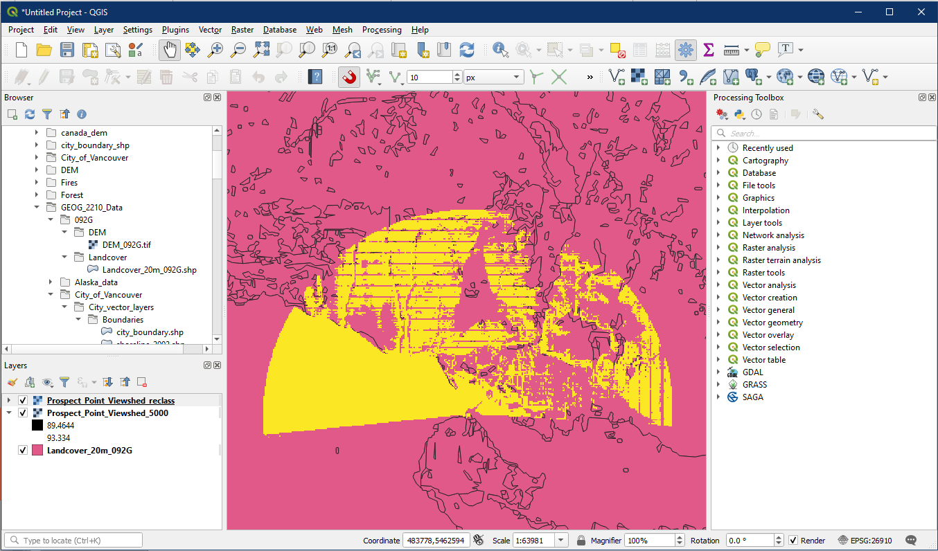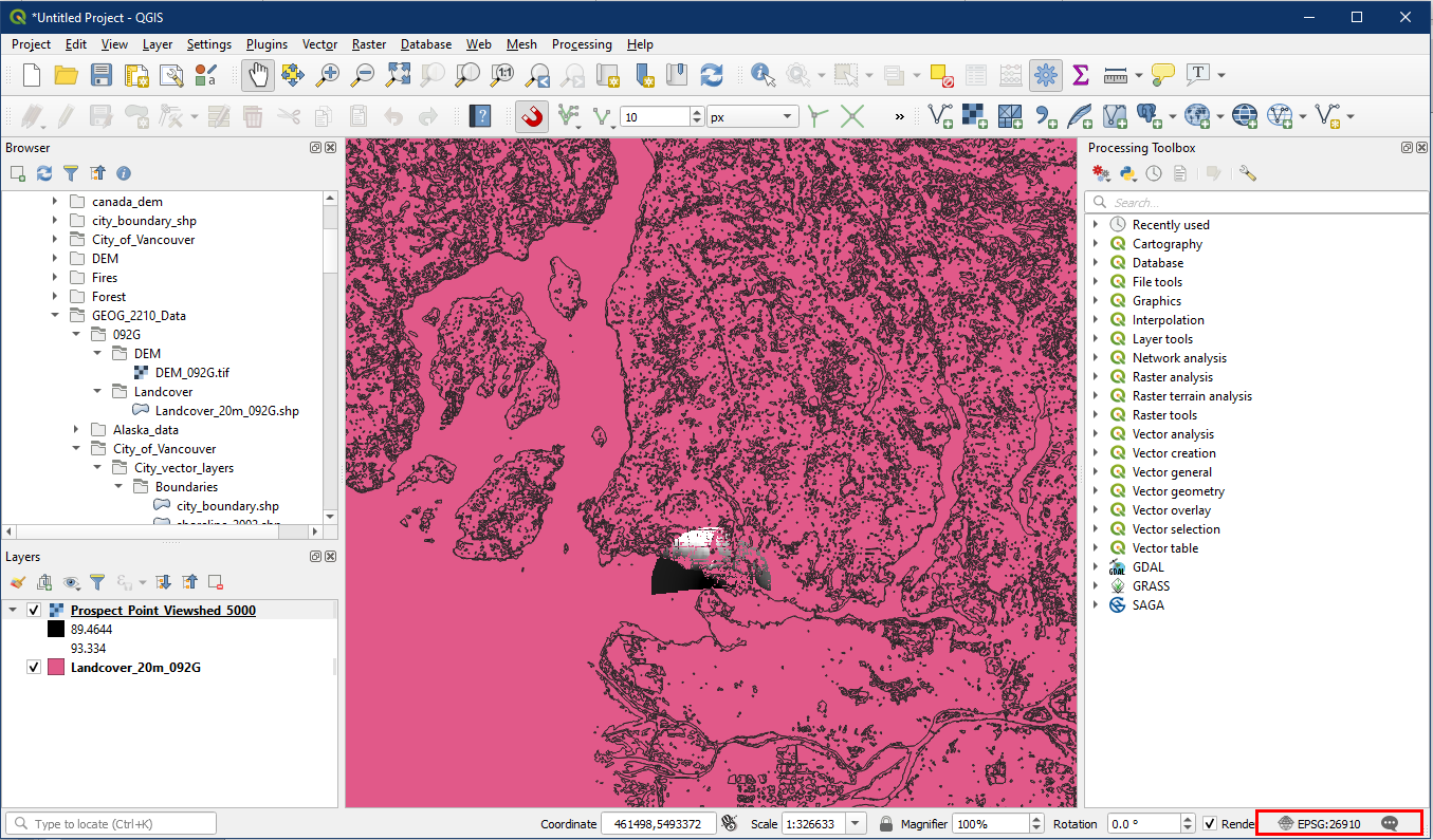Additionally, ensure the project CRS is in EPSG 26910. The viewshed tool we used in tutorial 19 produces an unknown CRS so want to ensure the project is in the proper CRS.