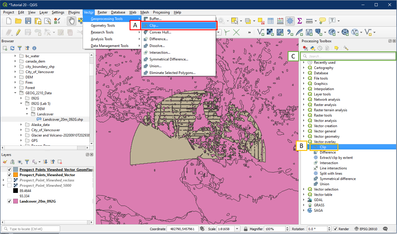 The next step is to extract or clip the landcover layer using the Prospect Point viewshed vector layer, in other words, we only want the portion of the landcover layer that coincides (or is the same) as the Prospect Point viewshed vector area.