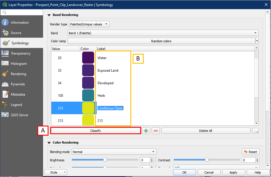 Go into the Symbology panel within the layer properties. Initially the layer will show lots of black/blank Symbology values, so click Classify (A) to remove them and to keep only the values found in the layer. Then rename the numbers under the Label column (B) based on the landcover classification codes shown below. Providing the actual name of each land cover type instead of numbers will be very helpful when making a map.