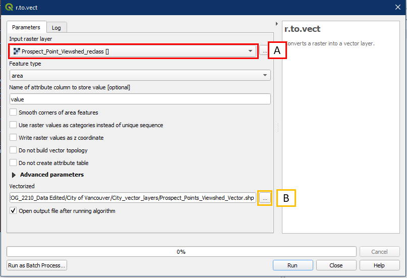 To convert from raster to vector, go to Processing Toolbox > GRASS > Raster > r.to.vect (A). Alternatively search for “r.to.vect” in the search box (B).