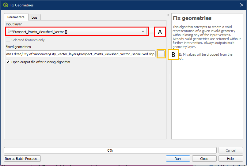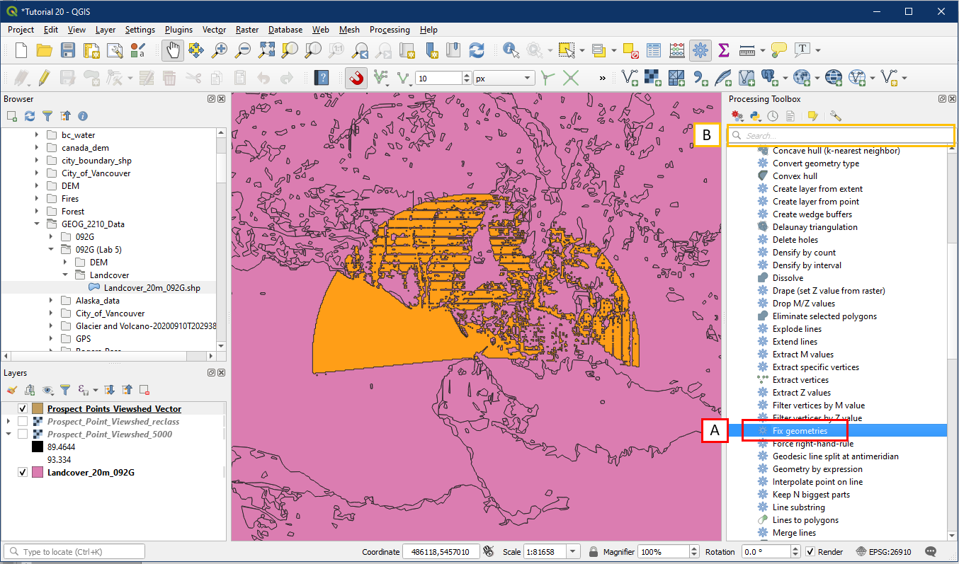 IMPORTANT: Currently, the raster/vector conversion tools produces vectors that have some geometry issues. So before moving onto the next step please run the Fix geometries tool. Go to Processing Toolbox > Vector geometry > Fix geometries (A). Alternatively search for it in the search box (B).