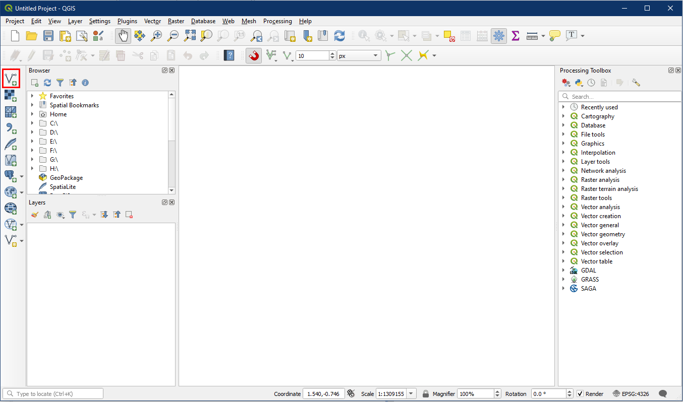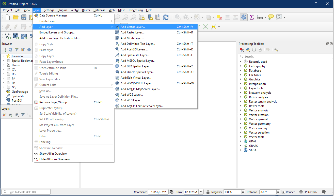 • Click Menu > Layer > Add Layer > Add Vector Layer…