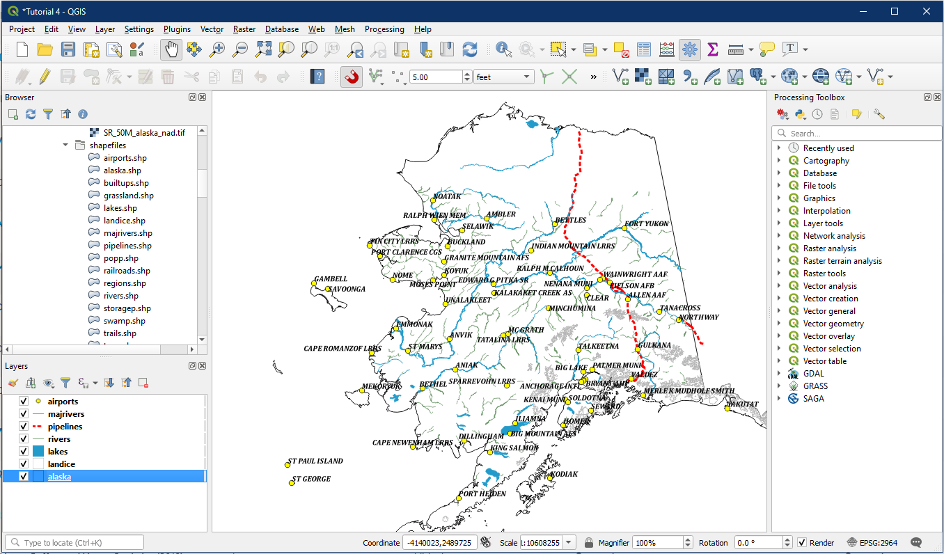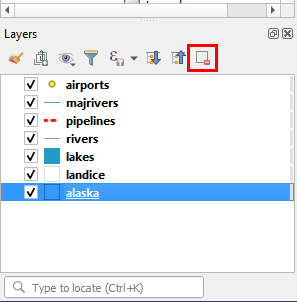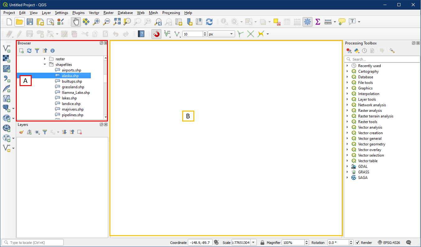 Open QGIS. In the Browser locate the shapefiles folder within Alaska_data (A). Select the following layers listed below from the Browser and drag them onto the map (B) to add the layers to the project. A “Select Transformation” window may appear, you can simply click OK. Notice that the layers will be listed in the Layer panel as well.