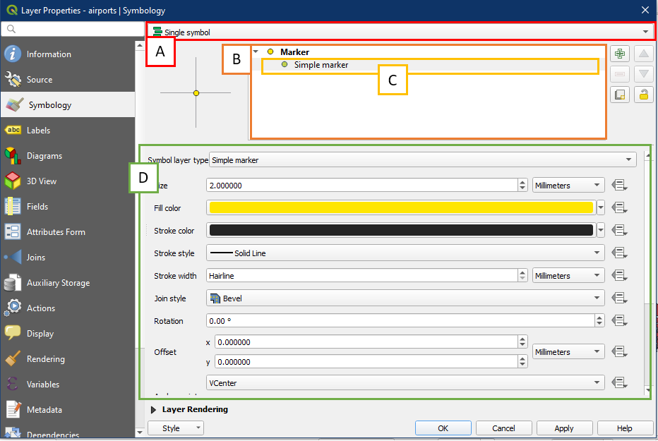 QGIS allows you to edit Layer properties through double-clicking the layer within the Layers Panel or through Menu Bar > Layer > Properties. Within Properties, the Symbology panel is used to change how the feature looks. Change the properties for the airports layer as follows. Under the Symbology panel, first select Single symbol (A), then in the box below (B) it will say Marker/Line/Fill depending on whether the layer is point, line, or polygon.