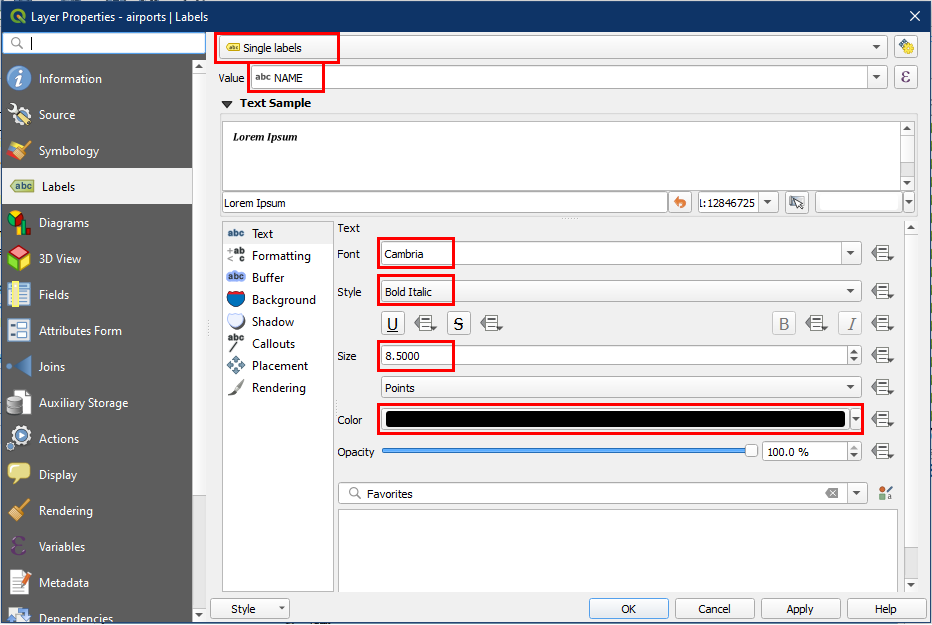 For the airport layer, we also want to add labels. To do this, go to the layer properties again, but this time choose the Labels panel. Adjust the label properties as shown below.