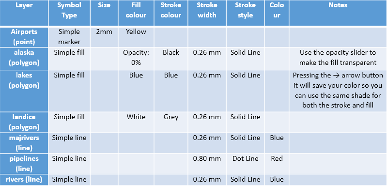 Adjust the properties as required based on the details below. Note that not all properties are applicable for each different layer type so some boxes are blank. For example points and polygons have separate fill and stroke colours, while lines only have one colour since there is no fill.