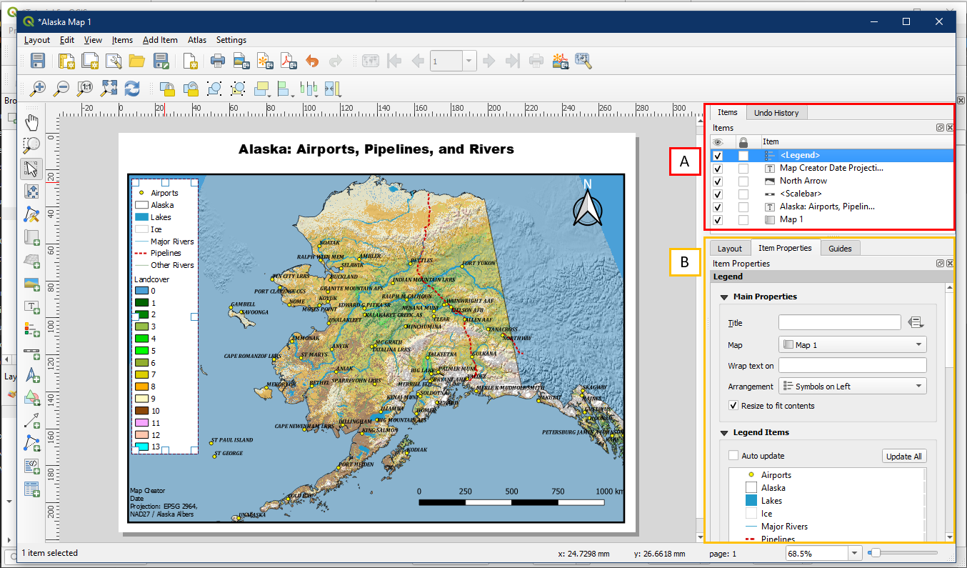 To make further modifications to any map element we have created, select it within the Items panel (A), and adjust the Items Properties as desired (B).