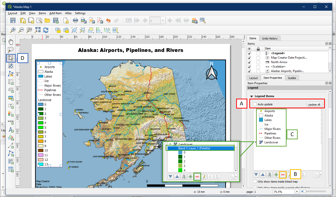 The layers inside the map box will likely be zoomed too far out right now, but we can adjust the view inside the box. First use the Select/Move Item button (B) again to have the map box selected. Then click the Move Item Content button (C) to centre the view of Alaska within the box by dragging with your mouse button within the map panel. Use your mouse scroll wheel or the Scale box under Item Properties (D) to adjust the zoom. A good map scale to use for this map 10000000. Finding the right scale for a map is tricky and often take a lot of adjusting and testing various scale values.